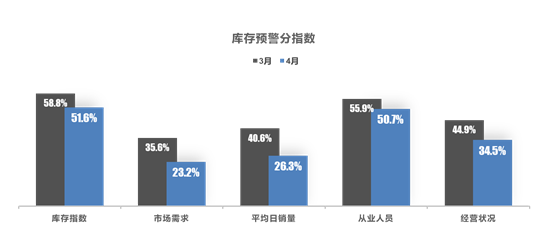 从分指数情况看:4月库存、市场需求、平均日销量、从业人员、经营状况指数环比下降。4月,上游汽车产业链受疫情影响停滞,下游终端受经销商闭店以及部分车型涨价影响,整体市场需求乏力,经销商面临盈利下滑、资金紧张的困境,部分经销商降薪裁员,员工流失率较高。