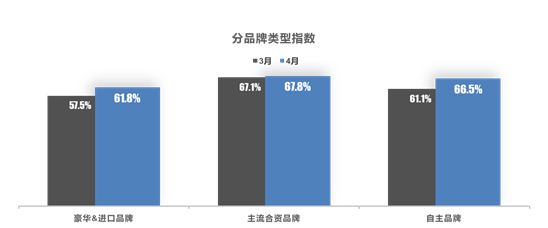 从分品牌类型指数看:4月进口&豪华品牌、主流合资品牌、自主品牌指数环比上涨。合资品牌市场需求超预期萎缩,销量下滑幅度较大导致库存预警指数较高。